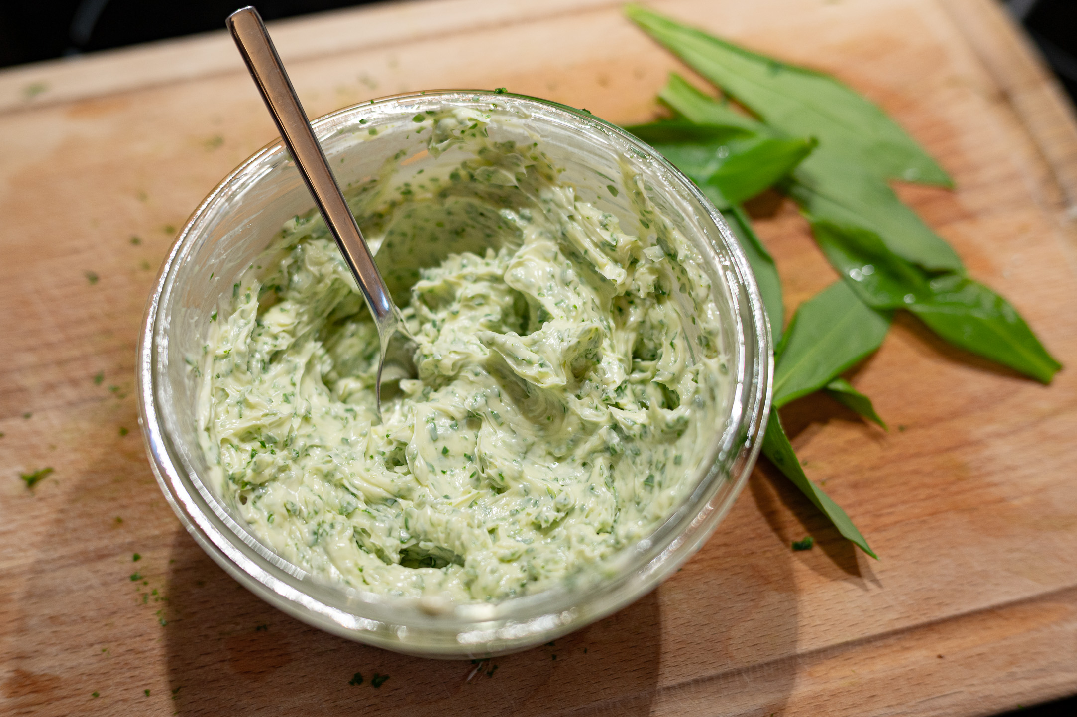 Die Butter leicht erwärmen, die Bärlauchblätter und die restlichen Zutaten gut mit der Butter vermengen.
